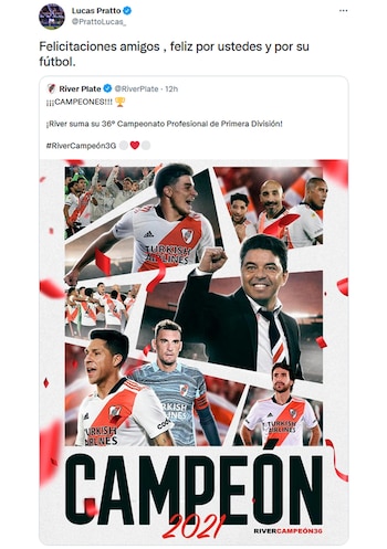 Unos de los primeros en aparecer fue Ignacio Scocco. El actual delantero de Newell’s Old Boys le mandó un cálido mensaje a los nuevos campeones de la Liga Profesional de fútbol junto a varios emojis de aplausos: “Felicitaciones jugadores, cuerpo técnico, dirigentes e hinchas por esta nueva conquista”. En paralelo, lo acompañó Lucas Pratto quien escribió un mensaje similar y alabó el estilo de juego que el Muñeco le inyectó a los jugadores. “Feliz por ustedes y por su fútbol”, redactó el Oso.