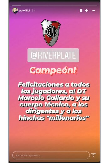 Por otro lado, personalidades como Alejandro Domínguez, Norberto Alonso, Sebastián Driussi y Rodrigo Mora directamente estuvieron en el estadio Monumental y mostraron la fiesta en primera persona a través de sus redes. El Pato Fillol también fue uno de los icónicos en vestir la banda roja que escribió unas palabras: “Felicitaciones a todos los jugadores, al DT Marcelo Gallardo y a su cuerpo técnico, a los dirigentes y a los hinchas millonarios”.
