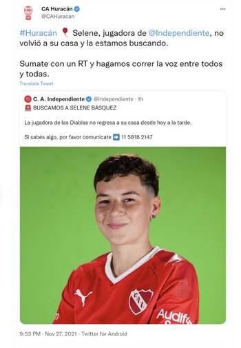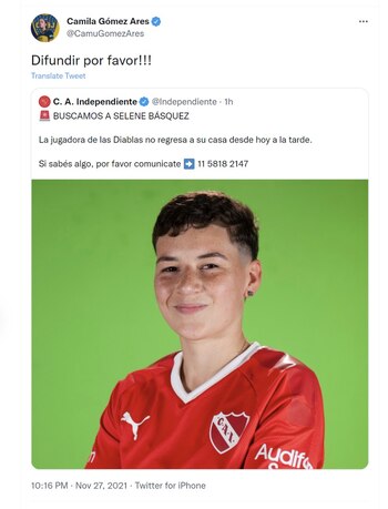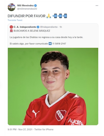 En tanto que, desde el área de Género y Diversidad de Independiente se sumaron a la búsqueda de la deportista y publicaron: “Selene Básquez, jugadora de fútbol de Independiente, no aparece desde las 15.20 hs. Estaba por Ing. Budge y se perdió todo contacto. Por favor, quién tenga algún dato no dude en contactarse”.