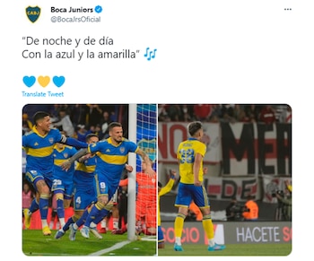 Pero hubo más. “Buen día. Hermosa mañana, ¿verdad?”, fue el recado del lunes por la mañana para repasar el triunfo superclásico, emulando al recordado comentario de Guillermo Francella en la película Extermineitors 3. Y continuó con “¿Grande? Uno solo. A lo Boca se vive mejor”. También citaron la canción de la hinchada con melodía del tema La Pollera Amarilla de Gladys la Bomba Tucumana, con una foto del domingo y otra del derby anterior en el Monumental cuando estrenó la casaca amarilla: “De noche y de día con la azul y la amarilla”. Finalizaron con otro hit, el de Quevedo con Bizarrap, haciendo hincapié en la victoria de la Reserva del sábado y la de la Primera el domingo: “El sábado teteo, el domingo misa”.