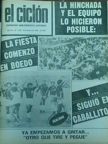 La fiesta soñada no pudo ser, porque la olla a presión que era la sociedad argentina en noviembre del ‘82, escribió otro capítulo, con una batalla entre el público que ingresó al campo de juego y policía que reprimió automáticamente. Una semana más tarde, el Ciclón dio la merecida vuelta olímpica en la Bombonera al enfrentar a Temperley, utilizando la camiseta que ya entró en la mitología futbolera con el auspicio de caramelos Mu-mu y la actriz mexicana Verónica Castro dando el puntapié inicial y enfundada en la casaca azulgrana. De los cuatro costados el grito: “Veo, veo. ¿Qué ves? Una cosa. ¿Qué es? Que Boedo ya se va de la B, para nunca más volver”. Y la voz de pueblo, una vez más, se hizo realidad.