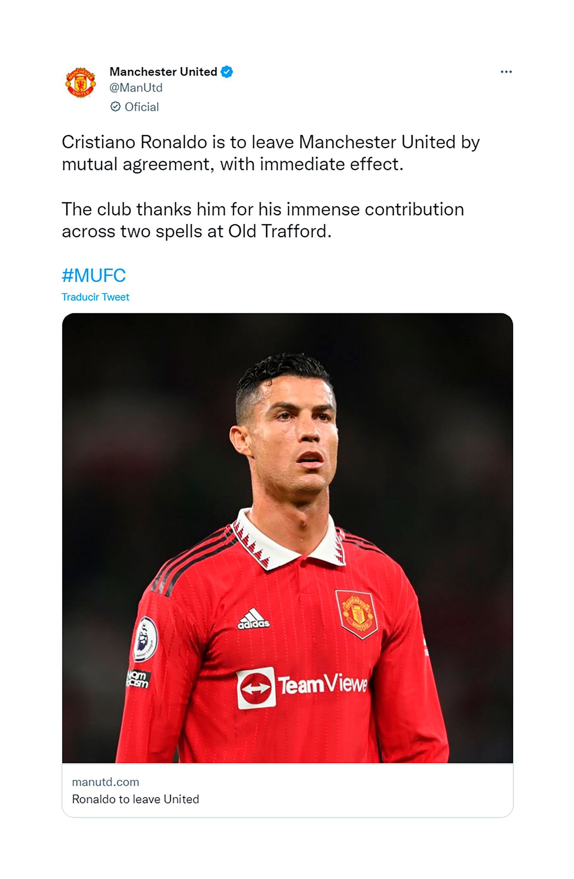 “Cristiano Ronaldo deja el Manchester United de mutuo acuerdo, con efecto inmediato. El club le agradece su inmensa contribución a lo largo de dos etapas en Old Trafford”. Con este escueto comunicado en sus redes sociales, los Diablos Rojos informaron en sus redes sociales el final de la segunda etapa del delantero portugués en el conjunto británico, cuando todavía le quedaban seis meses de vínculo (finalizaba en junio de 2023). Los roces permanentes desde el inicio de temporada y el choque frontal con las autoridades de la institución y el entrenador Erik ten Hag, que se agudizó con la entrevista que brindó la semana pasada, decantaron en el epílogo anticipado.