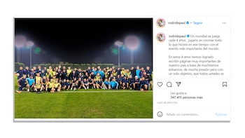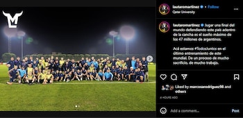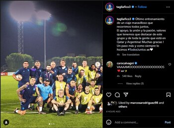 La imagen corresponde al entrenamiento realizado este sábado dentro del búnker de la Albiceleste con la presencia de todos los que participaron en el día a día del equipo que perdió en el debut ante Arabia Saudita y, de ahí en más, siempre ganó. Emiliano Martínez, Nicolás Otamendi, Ángel Di María, Julián Álvarez y Lautaro Martínez fueron algunos de los jugadores que la postearon dentro de sus perfiles de redes sociales.
