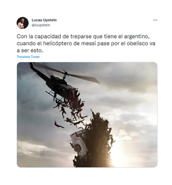 Primero, muchos apuntaron sus bromas al bronceado que iban a tener los jugadores en el bus ya que luego de dos horas apenas había avanzado un par de kilómetros por Riccheri y luego iniciaron las bromas sobre The Walking Dead. Es que mientras la caravana de los campeones se acercaba al Mercado Central, los millones que s habían congregado en el Obelisco iniciaron su marcha rumbo a la autopista 25 de mayo, al anoticiarse sobre que el vehículo no iba a tomar la Avenida 9 de Julio.