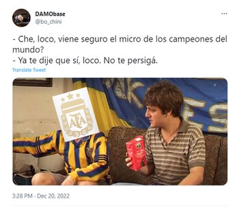 Este martes los futbolistas de la selección argentina amanecieron en el predio de la AFA en Ezeiza y cerca de las 12 del mediodía se subieron a un micro descapotable que tenía planeado recorrer la Ciudad de Buenos Aires para celebrar junto al pueblo. Pero, el caos fue total debido a una mala organización y el desborde provocado por los 5 millones de hinchas que colapsaron las autopistas y el centro porteño. Ante esto, en los usuarios en las redes sociales reaccionaron con memes.