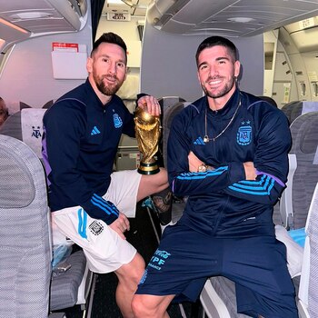 Otros compañeros elegidos por Messi para el recuerdo en las redes sociales fueron sus compinches durante todo el ciclo: Rodrigo De Paul y Nicolás Otamendi. Leo compartió una instantánea con el volante del Atlético de Madrid, solos con la Copa en medio de los asientos vacíos del avión. Al defensor lo incluyó en la grupal. “Y si vos sos el mago, ¿cómo no va a existir la magia?”, devolvió De Paul.