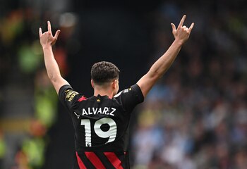 Corría el minuto 36 de la primera etapa cuando el ex delantero de River Plate recibió el balón en la puerta del área de parte del argelino Riyad Mahrez. El cordobés tomó la pelota y, ante la marca de João Palhinha, hizo una pisada que le permitió sacarse de encima al jugador portugués de los locales. Acto seguido, Álvarez sacó un derechazo que se pasó por encima del cuerpo del arquero Leno y se clavó en el ángulo superior derecho. Golazo y 2-1 para los visitantes, que sumaron su octavo triunfo consecutivo en el certamen para subirse a lo más alto de las posiciones.