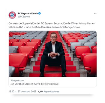 La información filtrada finalmente se confirmó minutos después de la obtención del undécimo título de liga: “Oliver Kahn deja de ser director general. También se cubrirá el puesto de director deportivo Hasan Salihamidžić. Así lo ha decidido el Consejo de Supervisión”.