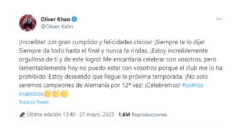 Lejos de quedarse callado, el histórico ex arquero alemán no tardó en pronunciarse en su cuenta oficial de Twitter: “¡Increíble! ¡Un gran cumplido y felicidades chicos! ¡Siempre lo dije! Siempre da todo hasta el final y nunca te rindas. ¡Estoy increíblemente orgulloso de ustedes y de este logro! Me encantaría celebrar con ustedes, pero lamentablemente hoy no puedo estar porque el club me lo ha prohibido. Estoy deseando que llegue la próxima temporada. ¡No solo seremos campeones de Alemania por 12ª vez! ¡Celebremos!”.
