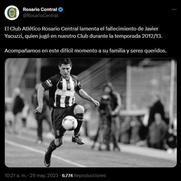 Otro de los clubes donde Yacuzzi dejó su huella fue Rosario Central y el club se sumó a los mensajes frente a la repentina muerte del jugador. “El Club Atlético Rosario Central lamenta el fallecimiento de Javier Yacuzzi, quien jugó en nuestro Club durante la temporada 2012/13. Acompañamos en este difícil momento a su familia y seres queridos”.