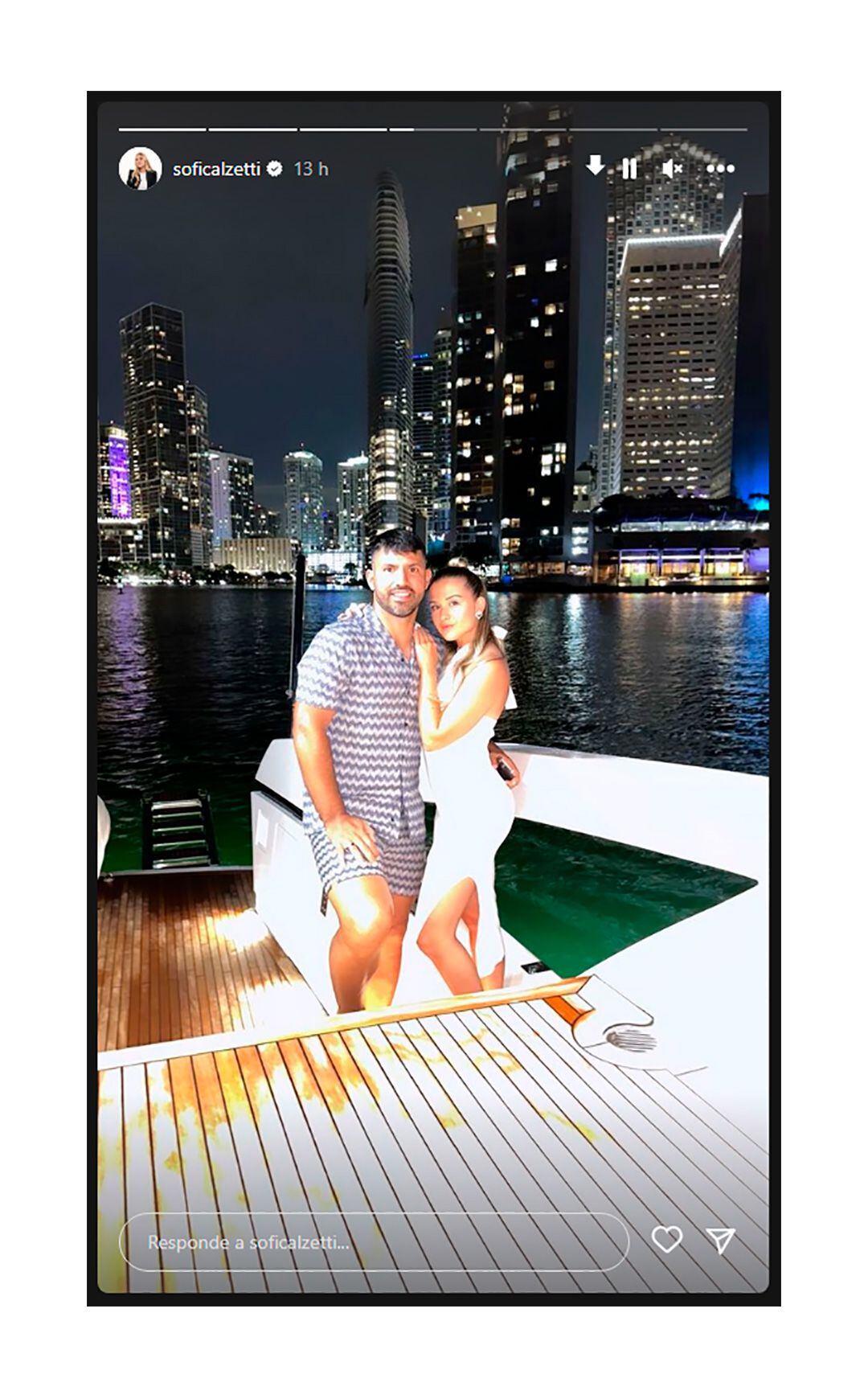 El ex futbolista de Manchester City y Barcelona, entre otros clubes, disfrutó de una velada romántica en una bella embarcación, que gozó con vista a la costa de uno de los siete emiratos que conforman los Emiratos Árabes Unidos. Calzetti mostró algunos detalles de la cena que compartieron con la particularidad de las velas encendidas a un costado de los platos, que le daban otro matiz al cumpleaños número 35 del delantero surgido en Independiente. Ella fue la encargada de ofrecer una jornada especial para su compañero de vida, debido a que destacó algunos toques de distinción en la torta que sirvió como el broche de oro de un nuevo natalicio en la vida de Agüero.