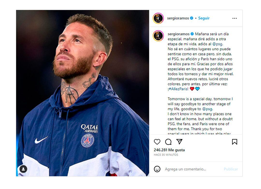 Por otro lado, el futbolista español emitió unas palabras en una publicación realizada dentro de su cuenta personal de Instagram, donde es seguido por más de 58 millones de seguidores y, aunque no explicó los motivos que condujeron a su decisión de no continuar, dio a entender de que no sería su retiro definitivo del fútbol: “Mañana será un día especial, mañana diré adiós a otra etapa de mi vida, adiós al PSG. No sé en cuántos lugares uno puede sentirse como en casa pero, sin duda, el PSG, su afición y París han sido uno de ellos para mí. Gracias por dos años especiales en los que he podido jugar todos los torneos y dar mi mejor nivel. Afrontaré nuevos retos, luciré otros colores, pero antes, por última vez: ¡Allez Paris!”.