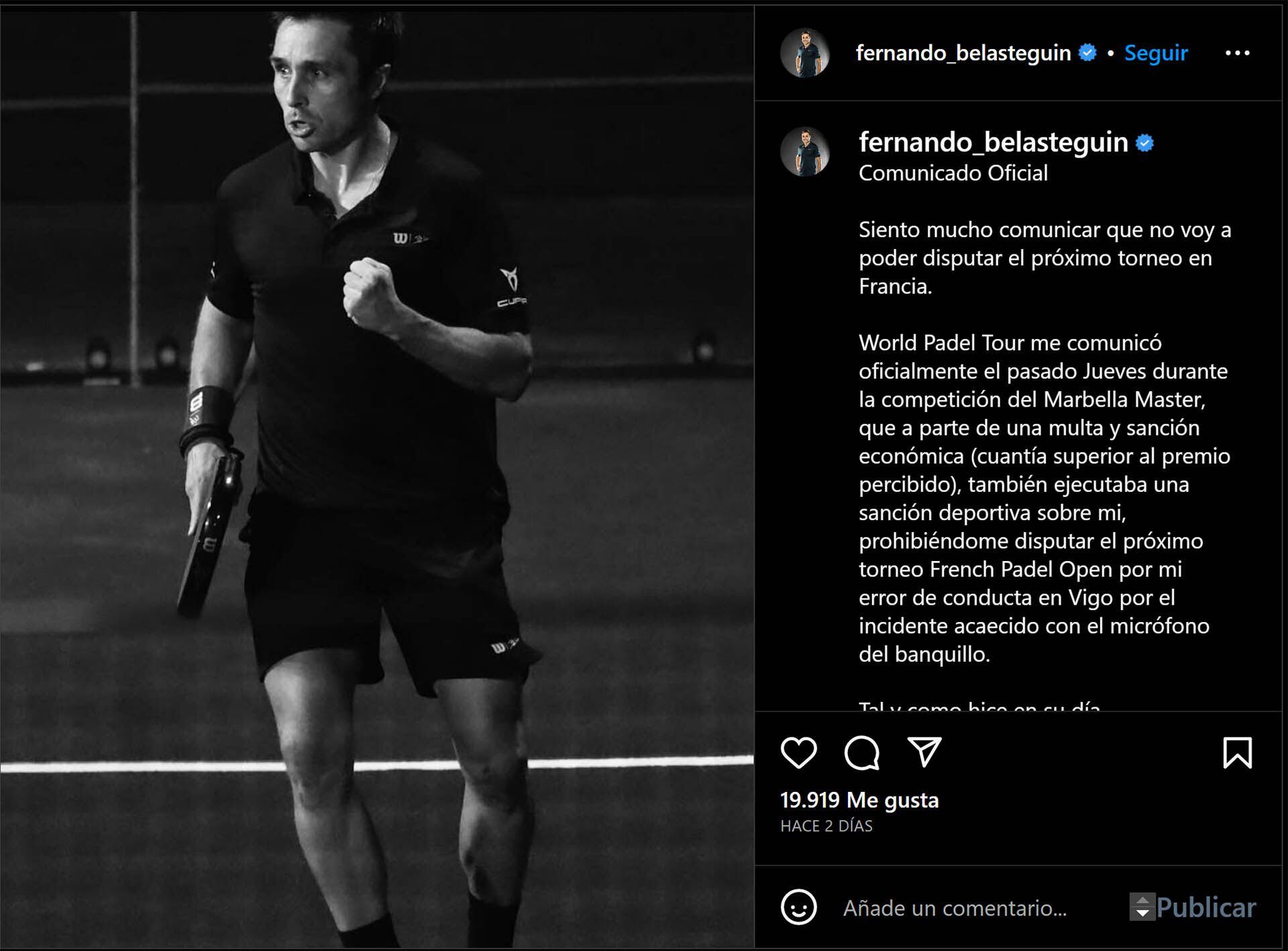 “Siento mucho comunicar que no voy a poder disputar el próximo torneo en Francia. World Padel Tour me comunicó que, a parte de una multa y sanción económica (cuantía superior al premio percibido), también ejecutaba una sanción deportiva sobre mi, prohibiéndome disputar el próximo torneo French Padel Open”, explicó.