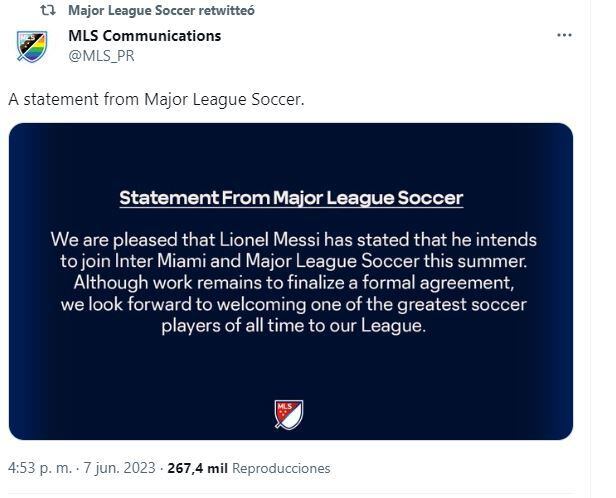 “Estamos encantados que Lionel Messi haya declarado que su intención sea unirse al Inter de Miami y la Major League Soccer en este verano. A pesar de que resta trabajo para formalizar el acuerdo, esperamos darle la bienvenida a uno de los mejores futbolistas de todos los tiempos a nuestra liga”, fue el comunicado oficial de la Major League Soccer (MLS) de los Estados Unidos.