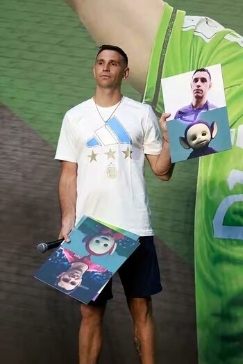 Uno de los momentos hilarantes fue cuando le acercaron unas imágenes suyas comparadas con los Teletubbies, personajes de televisión muy populares a comienzos de milenio. Aparentemente, Dibu sería parecido a ellos, sobre todo porque los colores de los buzos que ha utilizado en la selección se asemejan a los de estos simpáticos muñecos (rojo, violeta, verde y amarillo). Al tener que elegir su favorito, optó por el colorado, Po, entonces se llevó un llavero con su imagen y, obviamente, bailó al recibirlo para así llevarse los aplausos.