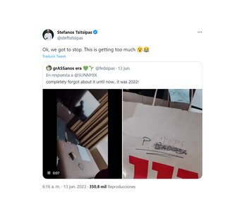 En el video, que Tsitsipas subió a sus redes, se puede ver cómo el griego da cuenta que a su habitación llegó un paquete de una marca de artículos de tenis a nombre de Badosa, pero que luego se borró y pusieron su apellido en la bolsa. “Tenemos que parar, esto es demasiado”, escribió Stefanos en Twitter ante la difusión del video. Esa respuesta se dio este 13 de junio y la que también apareció en escena fue Badosa.