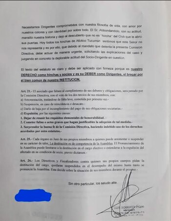 En tanto que Luis Roberto Pons, socio del conjunto tucumano, pidió formalmente a la CD su destitución. “Que en virtud de los hechos protagonizados, el día 25/06/2023 en la cancha de Boca Juniors en el partido despedida de Juan Román Riquelme, por el Socio y miembro de la H.C.D. Vocal Titular 2° Miguel Abbondándolo, el cual fue tomado por las cámaras de televisión de la transmisión del evento ‘flameando’ una bandera azul y oro en las tribunas tal cual lo haría un hincha de esa institución deportiva, siendo además que en horario paralelo al evento, nuestro primer equipo disputaría un partido de vital importancia por el campeonato contra Sarmiento de Junín”.