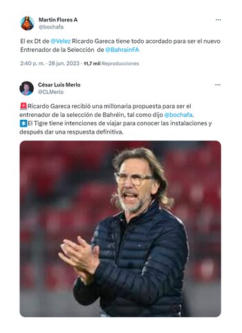 Pero 23 días más tarde el director técnico podría seguir en Asia y allí es requerido tanto en el mencionado seleccionado y en un equipo. La posibilidad más concreta estaría en Bahréin. “Ricardo Gareca recibió una millonaria propuesta para ser el entrenador de la selección de Bahréin, tal como dijo Martín Flores. El Tigre tiene intenciones de viajar para conocer las instalaciones y después dar una respuesta definitiva”, contó el periodista César Luis Merlo en su cuenta de Twitter, donde suele anticipar información de transferencias u otros movimientos en los clubes. Citó a su colega, quien había adelantado la información: “El ex DT. de Vélez Ricardo Gareca tiene todo acordado para ser el nuevo Entrenador de la selección de Bahréin”, aseguró Flores.