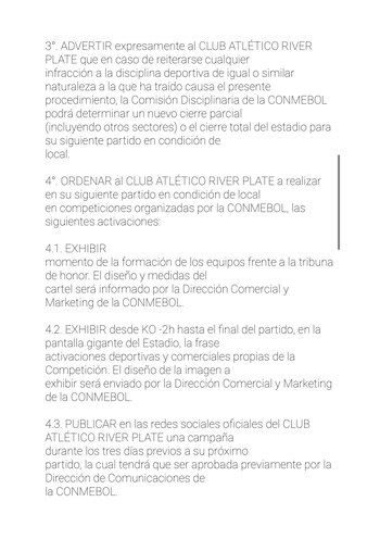 “El cierre parcial de la Tribuna se aplicará al 50% de la Centenario Alta exceptuando el sector destinado a los aficionados visitantes. El club informará a la Conmebol al menos siete días antes de su siguiente partido el plan operativo para la ejecución de esta medida, el cual deberá ser aprobado por la Dirección de Competiciones y Operaciones”, rezó el comunicado publicado en el sitio oficial de la organización.