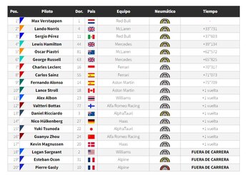 Verstappen logró su noveno triunfo, el séptimo en fila en el presente ejercicio. En el podio fue escoltado por Norris y Checo Pérez. El top diez lo completaron Lewis Hamilton (Mercedes), Oscar Piastri (McLaren), Charles Leclerc (Ferrari), George Russell (Mercedes), Carlos Sainz (Ferrari), Fernando Alonso (Aston Martin) y Lance Stroll (Aston Martin).