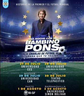 “Historias de la Premier y el fútbol mundial. Una noche con el Bambino Pons. Charlas de fútbol. ¿Para qué te traje?”, fue el anuncio de cartelera que brinda el reconocido periodista argentino que lleva más de cuatro décadas en el medio y quien saltó a la fama por su peculiar y divertida manera de relatar los partidos.