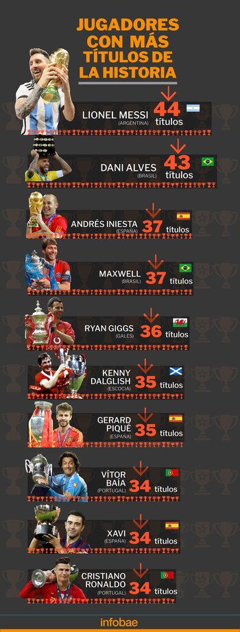 Lionel Messi es el futbolista argentino con más títulos en la historia, donde mantiene un amplio margen respecto de sus máximos perseguidores. Ángel Di María, gracias a la reciente Supercopa de Portugal, se colocó como su único escolta con 34. En tanto que Carlos Tevez (29) completa el podio.