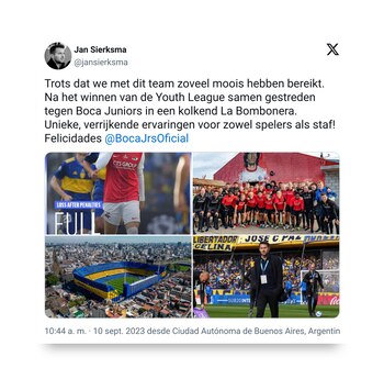 Este sábado Boca Juniors le ganó por penales al AZ Alkmaar de Países Bajos y se consagró campeón de la Copa Intercontinental Sub 20. Luego del 1-1 llegó la definición desde los doce pasos. Los juveniles del equipo Xeneize jugaron con el apoyo de 35 mil espectadores en La Bombonera y los neerlandeses quedaron impresionados por el ambiente y el que lo hizo saber fue su entrenador, Jan Sierksma, dejó un impresionante elogio en la conferencia de prensa.