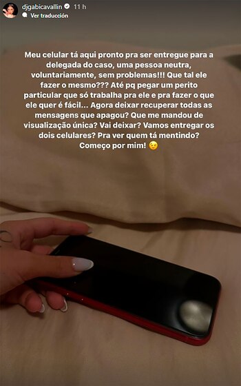 Del otro lado, la ex pareja del brasileño compartió una storie en sus redes sociales tras escuchar la entrevista: “Mi celular está aquí para ser entregado a la encargada del caso, una persona neutra. Voluntariamente, sin problemas (...) ¿Vamos a entregar los dos celulares para ver quien está mintiendo?”, le advirtió.