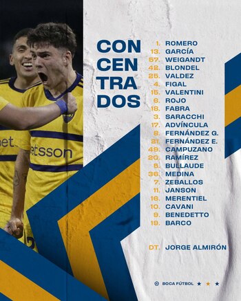 En caso de confirmarse este once, los cambios respecto a la última presentación serán un total de 8: Weigandt por Lucas Blondel, Figal por Bruno Valdez, Rojo por Nicolás Valentini, Fabra por Saracchi, Pol Fernández por Jorman Campuzano, Barco por Cristian Medina, Advíncula por Lucas Janson y Cavani por Miguel Merentiel. Y los únicos que repetirán entonces son Chiquito Romero, Equi Fernández y Zeballos.