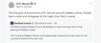El director ejecutivo, Stephen Bettis, comentó: “Esta es una noticia desgarradora para todos en Bramall Lane. Maddy tenía una posición única al ser parte de varios equipos en Sheffield United y era popular entre todos los que entraba en contacto. La personalidad y el profesionalismo la hicieron un crédito para su familia; la extrañaremos con tristeza. Mientras recibe las noticias y sigue adelante, el Club ofrecerá el mayor apoyo posible a la familia, los amigos y los colegas de Maddy”.