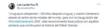 Este histórico anuncio generó la rápida reacción de los máximos mandatarios de los países implicados. En Uruguay, el presidente del país Luis Lacalle Pou no tardó en expresar su alegría en las redes: “¡Uruguayos campeones! 100 años después Uruguay y nuestro Centenario estarán el centro de las miradas del mundo para vivir la inauguración del Mundial Centenario 2030. Este reconocimiento hace justicia con aquellos pioneros que construyeron la historia del fútbol! Gracias!”.