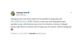 Otra personalidad en pronunciarse rápidamente fue Santiago Peña, presidente de Paraguay, quien manifestó su alegría a través de su cuenta de Twitter. “¡Paraguay será una de las sedes de los partidos inaugurales del Mundial Centenario 2030! Somos un país que está preparado para grandes cosas, solo tenemos que creer en nosotros mismos y trabajar unidos para llevar a nuestro país al lugar que se merece. ¡Vamos Paraguay!”, escribió.