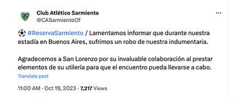 “Lamentamos informar que durante nuestra estadía en Buenos Aires, sufrimos un robo de nuestra indumentaria. Agradecemos a San Lorenzo por su invaluable colaboración al prestar elementos de su utilería para que el encuentro pueda llevarse a cabo”, informó el departamento de prensa de Sarmiento acotando que el partido debió retrasarse.
