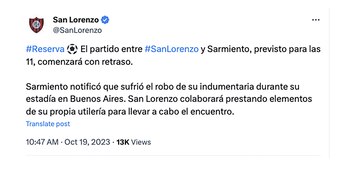 Por su parte, San Lorenzo replicó el posteo del club visitante en sus redes sociales y acompañó en el difícil momento: “Lamentamos mucho la situación que les tocó vivir. Ponernos a disposición era lo mínimo que podíamos hacer. Gran abrazo a toda la gente de Sarmiento”.