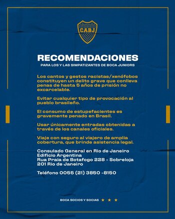 Desde Boca Juniors compartieron una lista con 5 recomendaciones para afrontar la estadía en Río: 1) evitar cánticos y gestos racistas que conllevan a penas de hasta 5 años de prisión; 2) evitar provocaciones a los brasileños; 3) no consumir estupefacientes; 4) usar entradas adquiridas en canales oficiales; y 5) viajar con seguro que brinde asistencia legal.