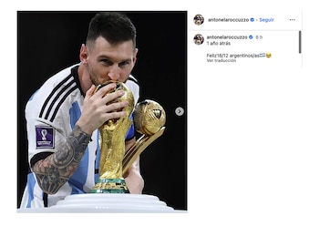 “1 años atrás. Feliz 18/12, argentinos”, escribió la esposa de Messi en su cuenta de Instagram junto a cuatro imágenes que consideró las más importantes para celebrar el primer aniversario de la obtención de la tercera estrella. La primera foto que abre el posteo fue la del capitán del seleccionado albiceleste besando la Copa del Mundo en el podio, sosteniendo en el brazo izquierdo el trofeo que recibió como mejor jugador del certamen.