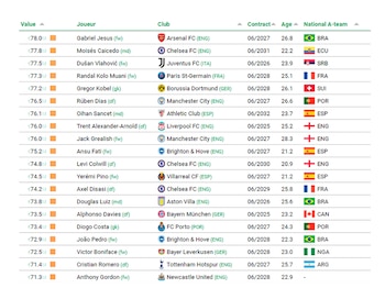 En total hay siete argentinos, de los cuales uno solo se ubica en el Top 10. Julián Álvarez, figura de Manchester City, aparece octavo por un valor de 164,7 millones de euros (USD 180,3 millones). El siguiente es Enzo Fernández, 17°, 123,6 millones de euros (USD 135,3 millones), Alexis Mac Allister, 18°, 105,1 millones de euros (USD 115 millones) y Lautaro Martínez, 33° 102,9 millones de euros (USD 112,6 millones). Ya más relegados quedaron Alejandro Garnacho, 59°, 94,5 millones de euros (USD 103,4 millones), Nahuel Molina, 84°, 79,4 millones de euros (USD 86,9 millones) y Cristian Cuti Romero, 99°, 71,4 millones de euros (USD 78,1 millones).