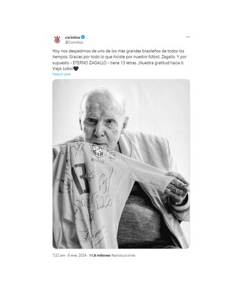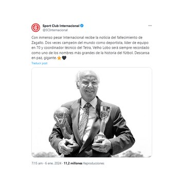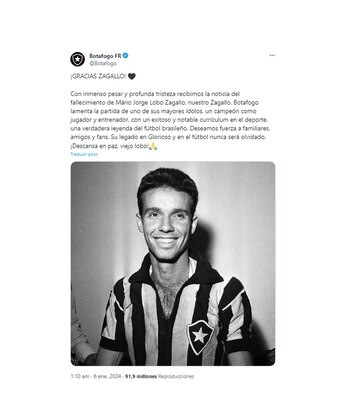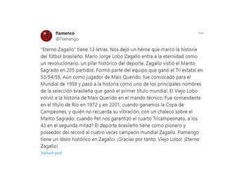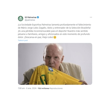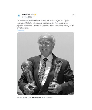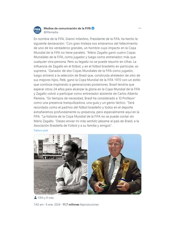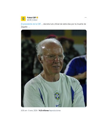 “Con gran tristeza les comunicamos el fallecimiento de nuestro eterno tetracampeón del mundo Mario Jorge Lobo Zagallo. Padre abnegado, abuelo cariñoso, suegro solidario, amigo fiel, profesional de éxito y gran ser humano. Un ídolo gigante. Un patriota que nos deja un legado de grandes logros. Damos gracias a Dios por el tiempo que pudimos pasar contigo y le pedimos al Padre que encontremos consuelo en los buenos recuerdos y en el gran ejemplo que nos dejas”, se expresó en el breve comunicado sobre la partida del ídolo. La causa de su muerte no ha sido divulgada.