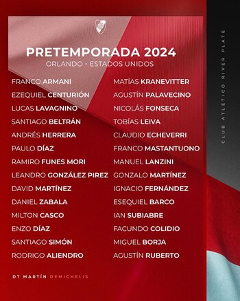 River Plate anunció además la lista de jugadores que irán a la pretemporada en los Estados Unidos. Miguel Borja, quien debió realizar trámites familiares en el extranjero, se sumará al resto de sus compañeros en Orlando. Por otro lado, los ausentes serán Pablo Solari y el uruguayo Sebastián Boselli debido a que se encuentran afectados a sus respectivas selecciones nacionales para el Torneo Preolímpico de Colombia que comenzará a mediados de mes.