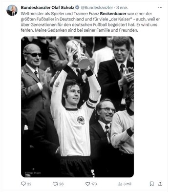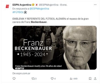 Por su parte, desde la cuenta oficial de Pelé, otro mito de la historia mundial, también se le dedicó un mensaje en portugués y en inglés dedicado al ex futbolista del Bayern Múnich. “Eran mucho más que buenos amigos. El Rey Pelé llamó a Beckenbauer su hermano. Compañeros de equipo, cuando jugaron juntos para el New York Cosmos, las dos leyendas cultivaron una hermosa y poco común amistad a lo largo de sus vidas. Esta es una despedida difícil para todo aquel que ama el fútbol. Sin embargo, esperamos que sea un hermoso reencuentro en el cielo. Gracias por todo, Beckenbauer”. Lionel Messi, en tanto, optó por poner una emblemática imagen del alemán con las letras que hacen referencia a “que en paz descanse”.