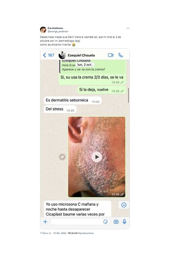 Ante semejante revuelo, fue su pareja, Evangelina Anderson, quien salió en su defensa para desterrar cualquier tipo de rumor. “Desde hace meses que Demi tiene el cachete así, acá mi chat el 2 de octubre con mi dermatólogo, Jajaj. Cómo les encanta inventar”, escribió en su cuenta de X junto a un print del diálogo con el especialista, quien sostiene que el DT padece una “dermatitis seborreica” producto del estrés.