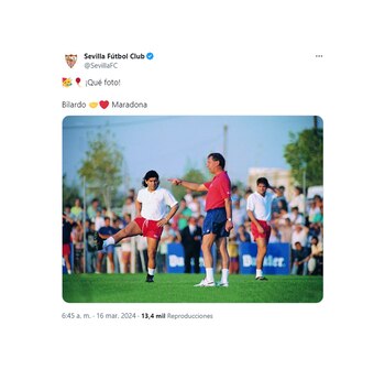 Luego, en otro tuit, añadieron “¡Qué foto’!, al colocar una imagen en la que Bilardo se encuentra dando indicaciones tácticas durante una práctica y a su lado se encontraba Diego Armando Maradona, quien recaló en la institución española por expreso pedido del DT.