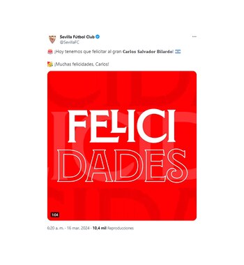 Otro de los primeros saludos que recibió fue el del Sevilla de España, entidad que dirigió en la temporada 1992/93. “¡Hoy tenemos que felicitar al gran 𝐂𝐚𝐫𝐥𝐨𝐬 𝐒𝐚𝐥𝐯𝐚𝐝𝐨𝐫 𝐁𝐢𝐥𝐚𝐫𝐝𝐨! ¡Muchas felicidades, Carlos!”, escribieron los andaluces.