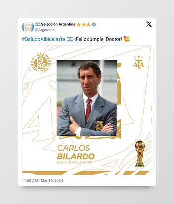 Uno de los principales saludos que recibió el campeón del mundo en México 1986 fue el del presidente Javier Milei, quien le dedicó un sentido mensaje en su cuenta en X (anteriormente Twitter). “¡FELIZ CUMPLEAÑOS DOCTOR! Muchas gracias por tantas alegrías y en especial por las enseñanzas para la vida...!!!”, escribió el mandatario junto a una foto del estratega durante su paso por la Albiceleste.