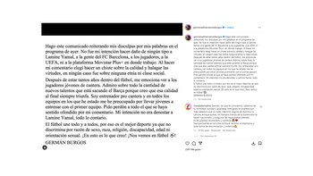 Sin embargo, tras la conclusión del programa, Germán Burgos quiso explayarse en sus disculpas y utilizó sus redes sociales para publicar un extenso comunicado: