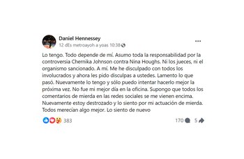 “Lo tengo. Todo dependió de mí y asumo toda la responsabilidad por la controversia. Me he disculpado con todos los involucrados y ahora les pido disculpas a ustedes. Lamento lo que pasó, no fue mi mejor día en la oficina. Supongo que todos los comentarios de mierda en esas redes sociales se me vendrán encima. Estoy destrozado y lo siento por mi actuación. Todos merecían algo mejor. Lo siento de nuevo”, escribió.