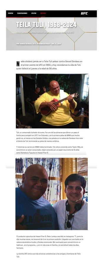 La compañía de UFC, en tanto, se pronunció a través de un comunicado oficial: “Nadie olvidará jamás ver a Teila Tuli pelear contra Gerard Gordeau en el primer evento de UFC en 1993, y hoy recordamos la vida de Tuli, quien falleció a la edad de 56 años. La familia UFC envía sus más sinceras condolencias a los amigos y familiares de Teila Tuli”.