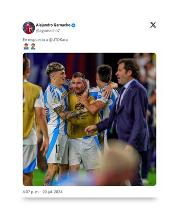 La polémica surgió cuando un video publicado en X (exTwitter) mostró imágenes de Garnacho y Messi durante la final de la Copa América ante Colombia en el Hard Rock Stadium. En el video, el usuario insinuaba una mala relación entre ambos jugadores basándose en un par de escenas captadas durante el partido. “Alejandro Garnacho ignorando a Messi todo el partido. Fanático de Ronaldo”, escribía el usuario junto a los recortes que pretendían demostrar su punto de vista.