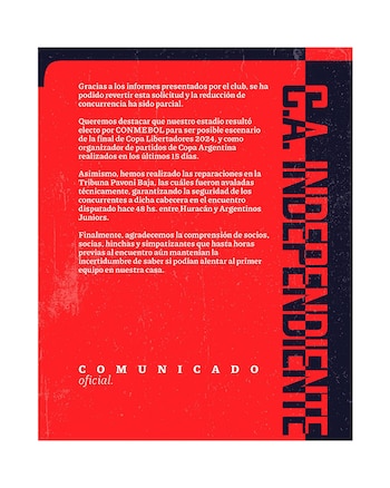 Ante esto, la entidad de Avellaneda le avisó a sus hinchas: “Debido al fallo judicial que dispuso la reducción del aforo de las tribunas populares, recordamos que, a partir de las 10.30 hs, todas las personas que asistan a las cabeceras Santoro y Pavoni bajas deberán volver a canjear sus bonos”. Estos movimientos de emergencia se deben a que el fallo judicial se conoció durante la madrugada del sábado, a menos de 24 horas del partido contra el Canalla.