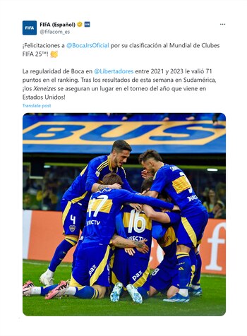 Luego de confirmarse su clasificación, la FIFA felicitó al equipo de La Ribera. “¡Felicitaciones a Boca Juniors por su clasificación al Mundial de Clubes. La regularidad de Boca Junios en Copa Libertadores entre 2021 y 2023 le valió 71 puntos en el ranking. Tras los resultados de esta semana en Sudamérica, ¡los Xeneizes se aseguran un lugar en el torneo del año que viene en Estados Unidos!”